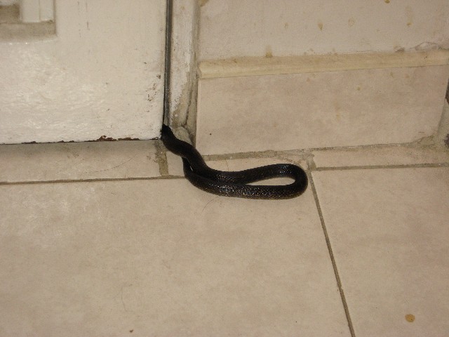 ボゴタではヘビを見ることはめったにないんですが、うちはこれで2回目です。1回目は何年か前、バスルームにいました。このときはかなり驚いて、そもそもどこから入ってきたのかと思ったんですが、こんな狭いドアの隙間から入ってこられるものなんですね。
