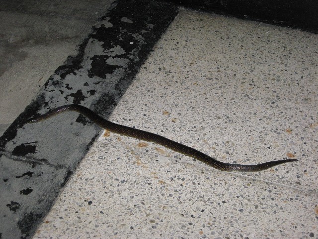2~30分後に夫が帰ってきたとき、まだヘビ子さんは玄関のすぐ外にいたようです(スペイン語ではヘビは女性名詞なので女性扱い)。全身像を撮ってみました。