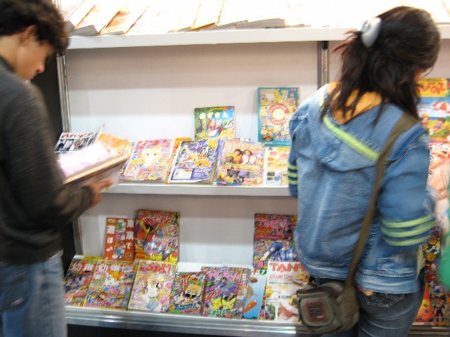 パビリオンのほかのところには、ここは日本の本屋ですかみたいなコーナーもできていました。雑誌はだいたい数年前のもののようだったので、コロンビアを離れる駐在員や家族の人が残していったものでしょうか。これはもちろん展示のみで、持って帰ってはいけません。日本パビリオンの出口チェックは厳しかったです。