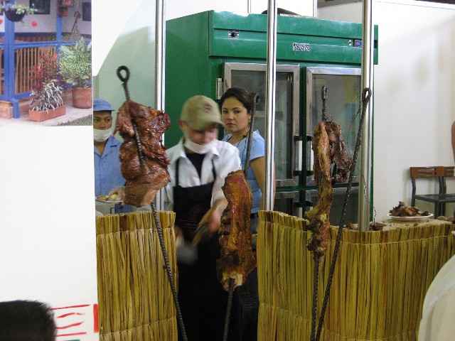 馬を堪能したので昼食に行きました。ファーストフードでない食事がイベントの中にあるのはほぼ、このイベントだけです(食関係のイベントだとあるのかも)。いきなりチグイロの串刺しに遭遇。カピバラのことです。高いんですよ、これ。油っこくて固いので、個人的にはそれほど好きではありません。