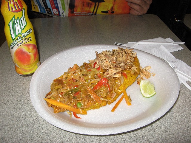 今回は普通の昼食っぽいのが見つからず、こういうのを食べてみました。お好み焼きのように見えますが、下の台はプラタノ(調理用バナナ)を平たくつぶして揚げたもの。南国っぽい料理です。パタコンといいます。パタコンは青いプラタノを使い、甘くありません。けっこうおいしかったです。ただ、パタコンはたいてい固いので、プラスチックのナイフなんかでは切れません。結局、上に載ってる野菜炒めとかをいくらか食べて量を減らし、その後手で持ってピザのように食べることに。7500ペソでした(たぶん)。もちろん現地で食べればもっと安いはず。